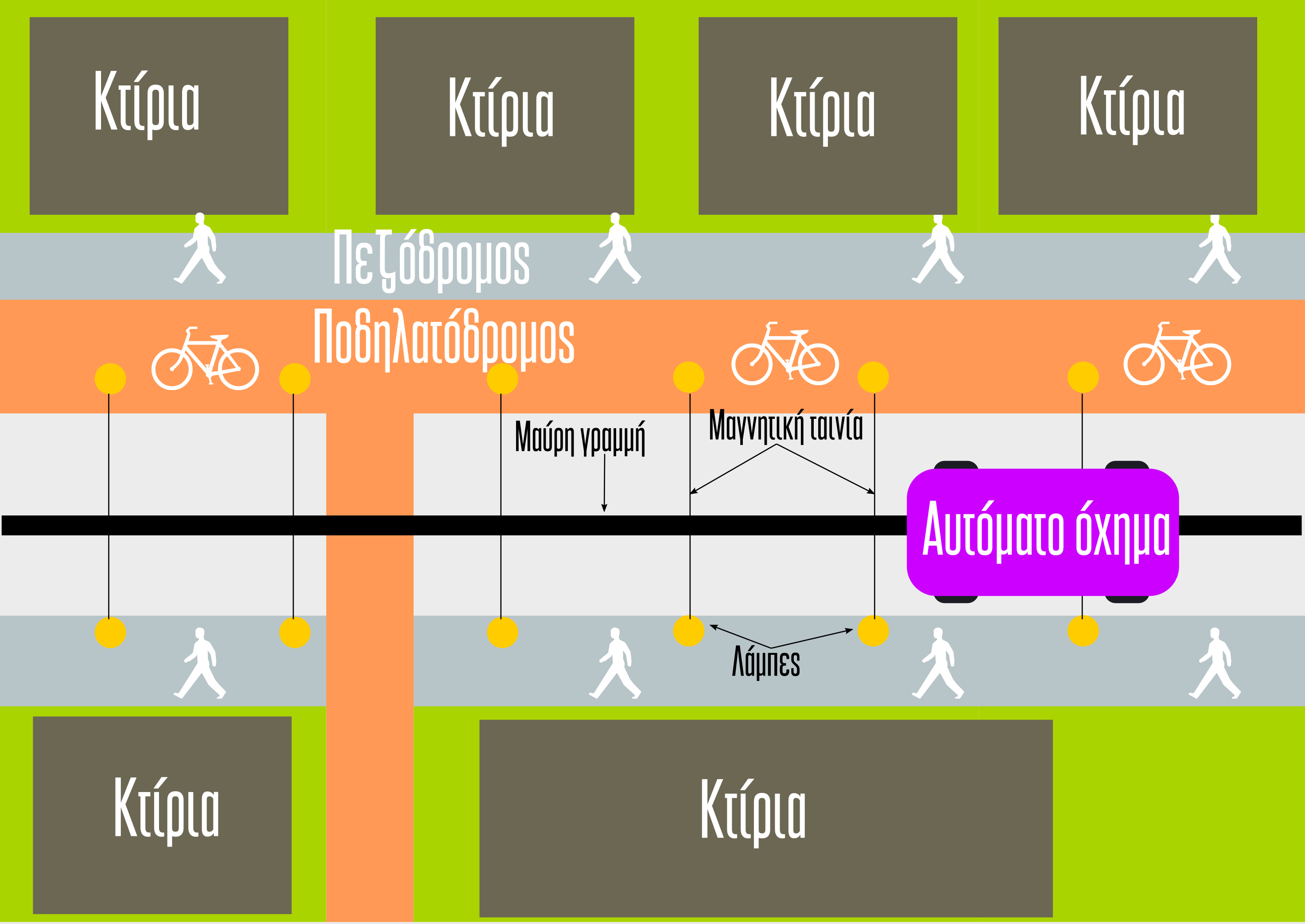 Για να μπορεί να καταλαβαίνει το όχημα μας σε ποιο σημείο της διαδρομής βρίσκεται θα υπάρχουν μαγνητικές ταινίες τις οποίες θα αντιλαμβάνεται καθώς τις διασχίζει.