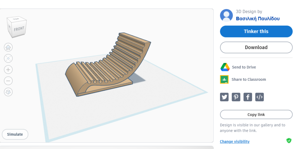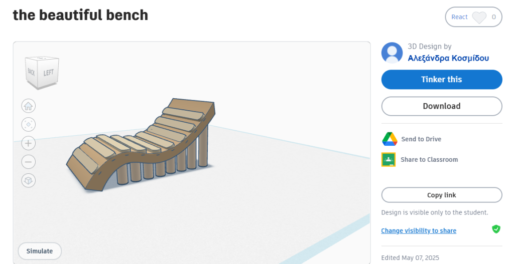 - Παγκάκια και χώρους ανάπαυσης για όλους τους πολίτες με έμφαση στην προσβασιμότητα. Τα παγκάκια σχεδιάζονται από τους μαθητές μας στο TInkerCAD και εκτυπώνονται σε 3Δ εκτυπωτή. Τα παγκάκια θα πρέπει να δίνουν έμφαση στην προσβασιμότητα όλων των ατόμων, καθώς και σε έξυπνες λύσεις σκίασης και εξοικονόμησης ενέργειας.